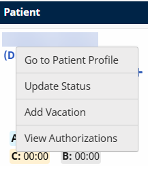 The menu items described below are available for Internal Patients. The menu items available for Linked Patients include Go to Patient Profile, Edit Masterweek, and View Authorizations.