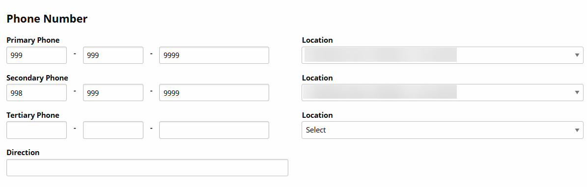 To associate a Patient address with a phone number, go to the applicable Patient Profile page under Patient > Profile, and click Edit. In the Phone Number Information section, Phone Location fields are displayed under each Phone field (Home Phone, Phone 2, and Phone 3). To connect the phone to an address, select the applicable address previously entered in the Patient Profile Address section from the Phone Location list.