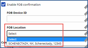 If a Patient has been set up with an FOB device, then the Patient Addresses can be associated to the FOB device in the Patient General page under Patient > General. An FOB Location field is used to associate an address to the device. On the FOB Location dropdown, select the applicable address as entered in the Patient Profile page.