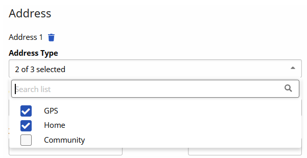 Home and GPS options are displayed as Address Types to categorize the Patient's address. Although Address Types is a multi-select column, the options of Home (services provided in the patient's home) and Community (services provided outside the patient's home) cannot be selected together. A Patient address cannot be listed as both a home and a community.