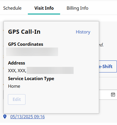 After a call is successfully linked, the address (if available) is stored and visible in the Visit Info tab of each visit, along with the EVV ID used for the confirmation. Hover over the telephone icon next to the EVV Call In and EVV Call Out fields to view the stored address.