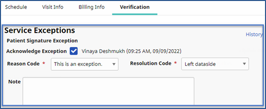 The Verification tab also includes a Service Exceptions section to independently confirm that all required services were provided to the Patient. Service Exceptions appear when further confirmation is required for the verification.