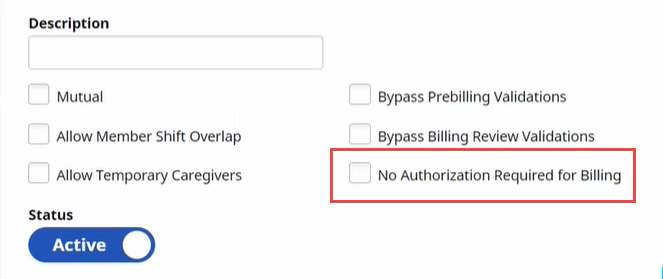 Payers can select No Authorization Required for Billing for any Home Care Service Code on the Add Service Code or Edit Service Code page.