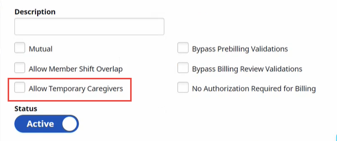 The Payer can select Allow Temporary Caregivers for any Home Care Service Code on the Add Service Code or Edit Service Code page.