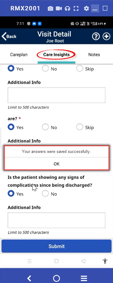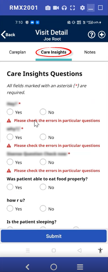 The following images are examples of the Care Insights tab with all questions answered and saved with the Submit button and with questions remaining that require a response.
