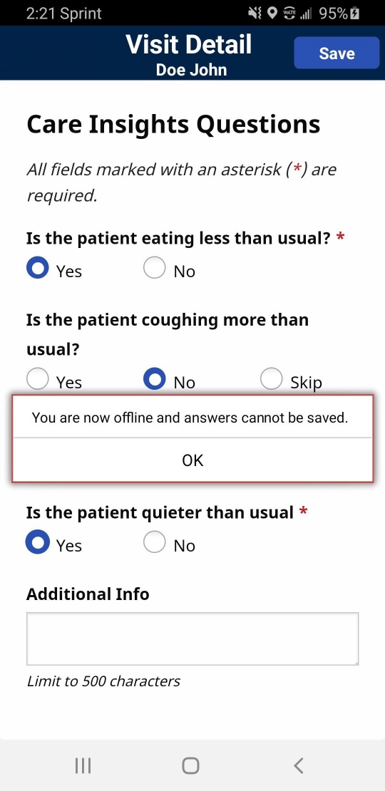 If a Caregiver loses reception on their mobile device while working in Care Insights, questions cannot be saved and the warning at bottom right appears. If a Caregiver has no reception on their mobile device before starting Care Insights, questions do not appear.