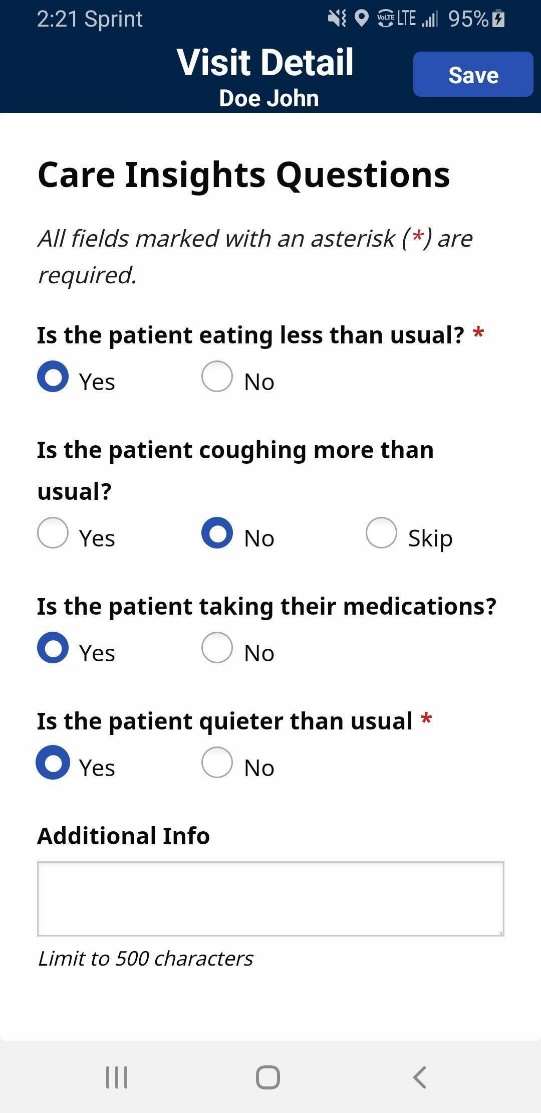 Caregivers answer Payer Care Insights questions after entering Duties in the mobile app (During Clock-Out) or through the Care Insights tab during or after a visit (before or after Clock-Out).