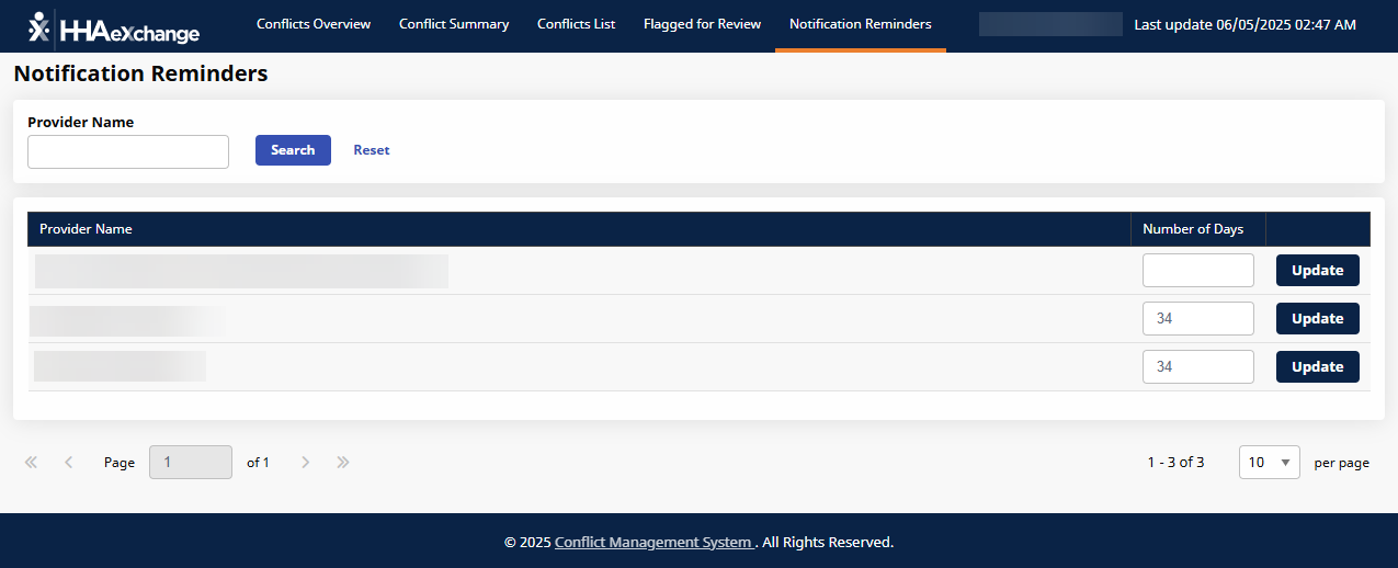 The Notification Reminders feature under Provider and Caregiver > Conflict Management Dashboard is used to schedule automated reminders for the Provider to check unresolved conflicts after the time selected in the Number of Days field. To schedule an automated reminder for the provider, add the number of days until reminder is sent in the Number of Days field and then select the Update button.