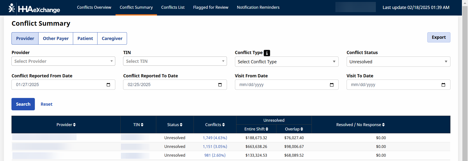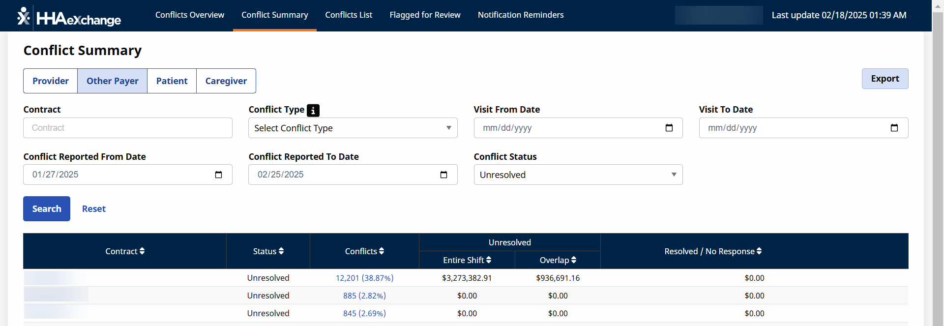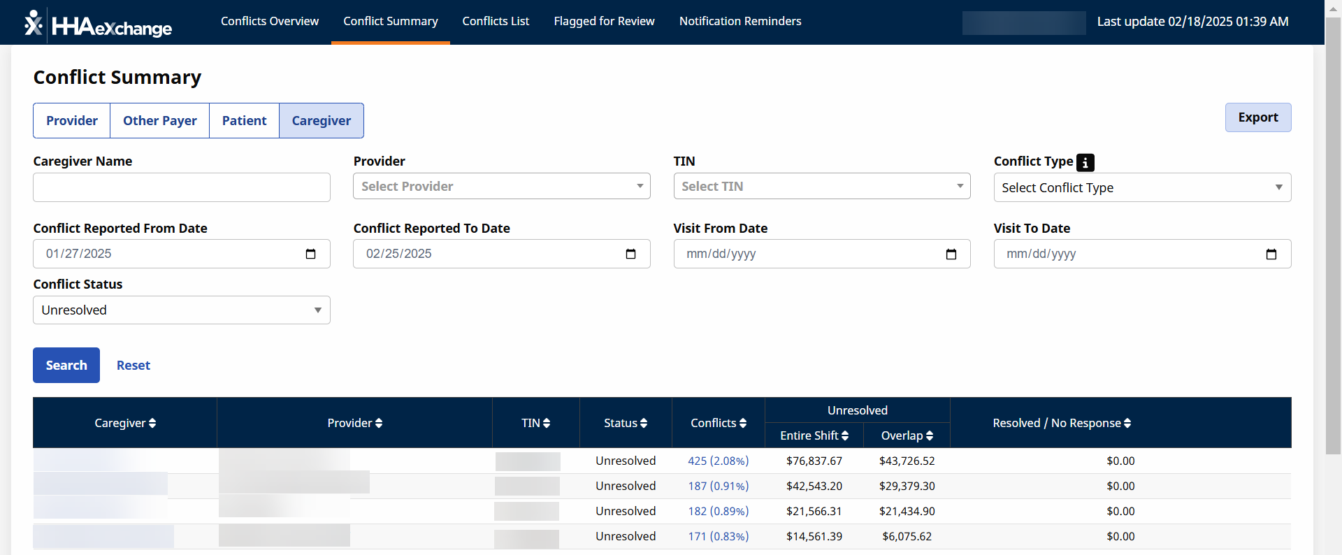 The Conflict Summary page under Provider and Caregiver > Conflict Management Dashboard is designed to help providers and payers quickly identify and resolve instances where the same caregiver is scheduled for overlapping visits at two different agencies. Use the following searches to find the conflicts quickly.