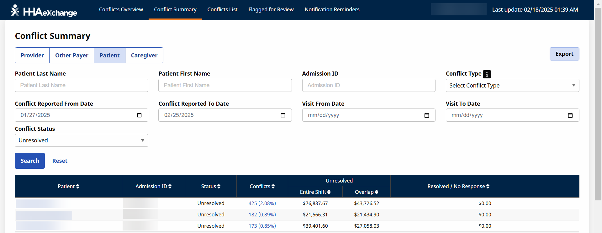 The Patient Conflict Summary results under Provider and Caregiver > Conflict Management Dashboard list conflicts for clients associated with the conflicts reports. The Client’s Admission ID is Restricted for those patients associated with a different payer.