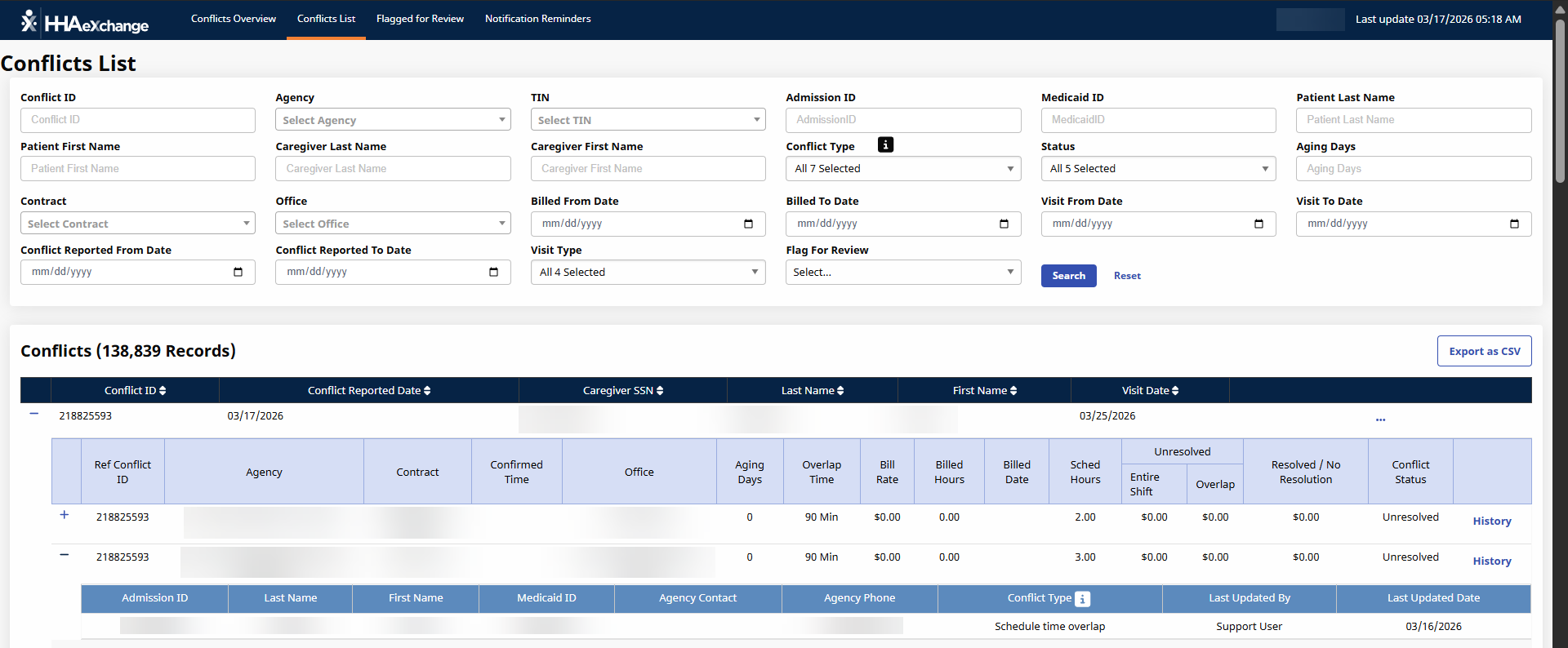 When the conflict is expanded, the name and phone number of the conflicting agency displays. Other details available from this expanded view: Conflict Type, Status, Overlap Time, and Last Updated Timestamp. To download the conflict, click the Export as CSV button.