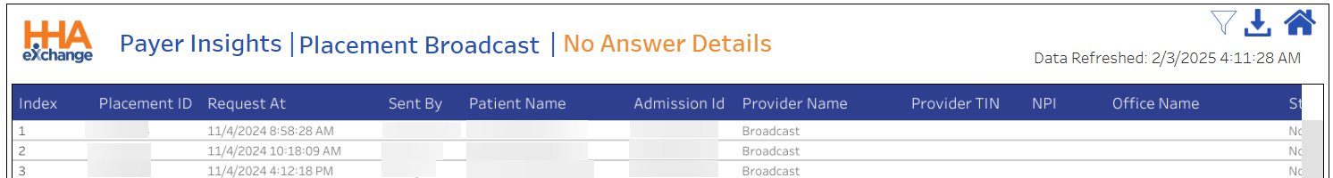 The No Answer Details Dashboard displays information about placement broadcasts that received no answers.