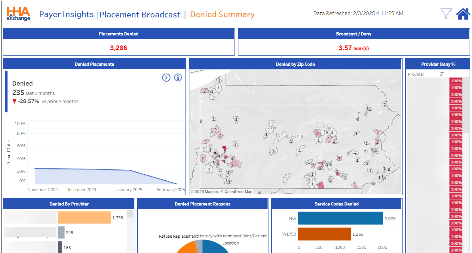 The Placement Broadcast dashboard under Dashboards, provides valuable insights related to broadcast placements. It includes trends in broadcast activity, provider rankings for accepted and denied placements, broadcast turnaround times, and reasons for denied placements by providers.