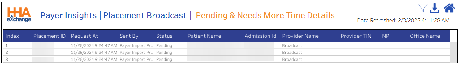 The Pending & Needs More Time Details Dashboard displays information about placement broadcasts that are still pending.