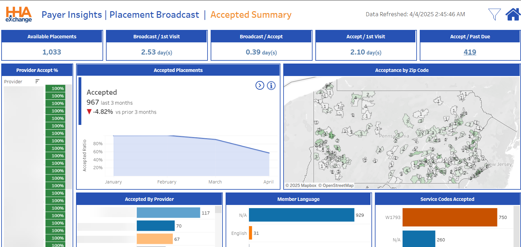 The payer platform offers our customers the ability to broadcast across their network for member placements. Payers can use this information to analyze placement performance, providers acceptance rates, turnaround times, etc.