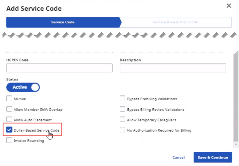 In the Payer Portal, when a Home Health (Service Category) Service Code is created with a Rate Type of Visit, users can select to make the Service Code a Dollar-Based Service Code.