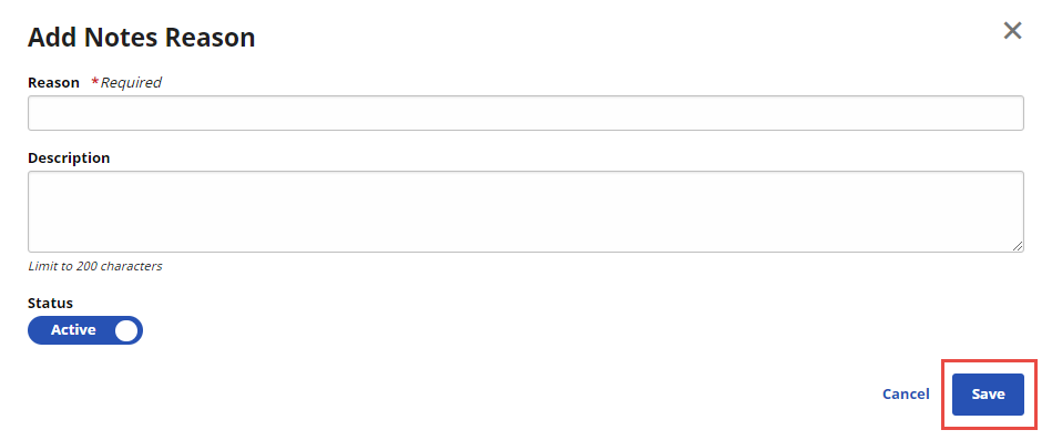 Select the Reference Table at left and click the Add button at top right (Add Notes Reason in this example).