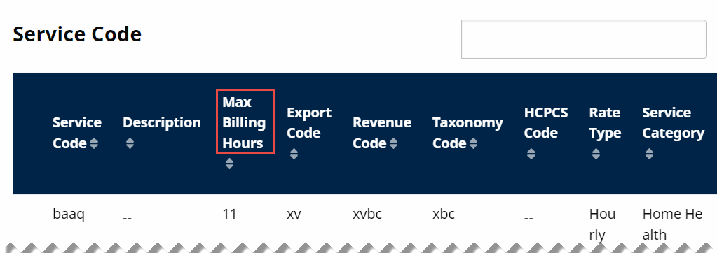 Maximum Billing Hours Per Day (Max Billing Hours) is only displayed for a Home Health Service Code in the Payer Portal when the Provider is set up to use the Maximum Hours Prebilling Rule. Contact HHAeXchange Support for assistance with this Provider application setting.