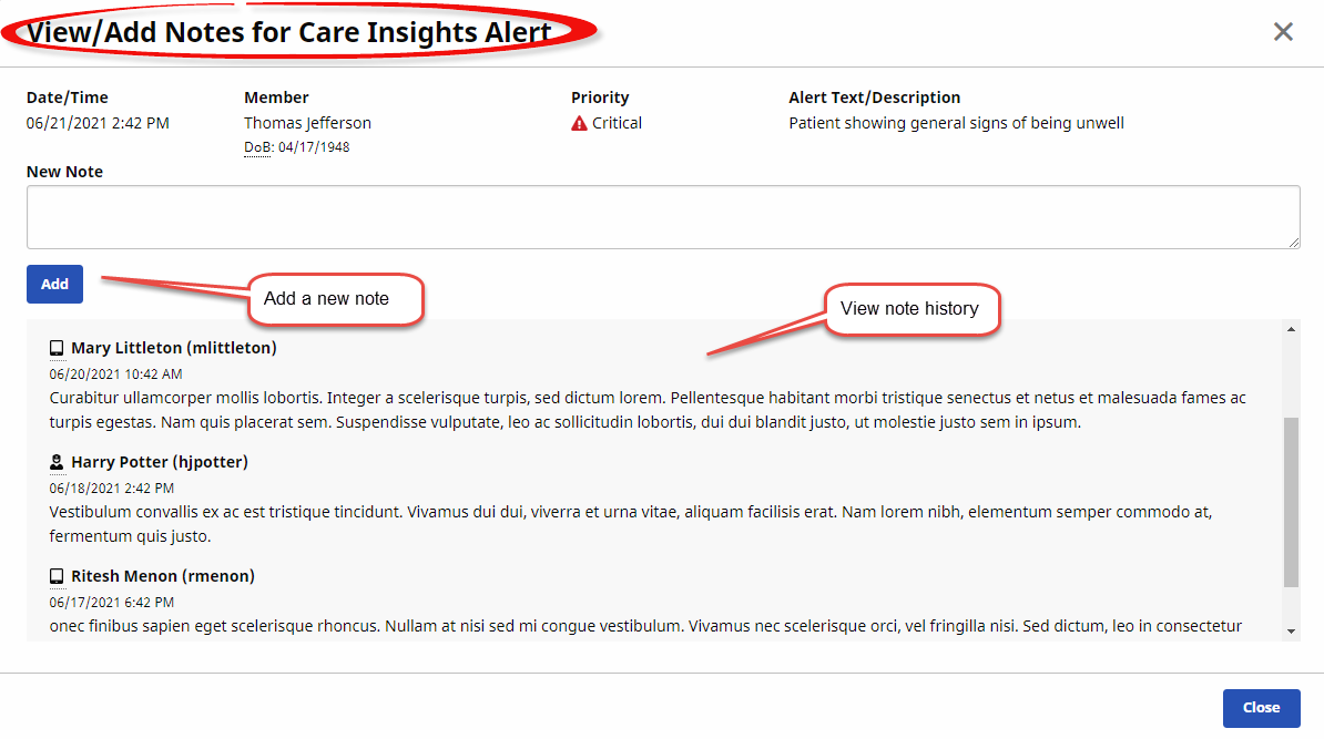 See the following image for an example of the View/Add Notes for Care Insights Alert window.
