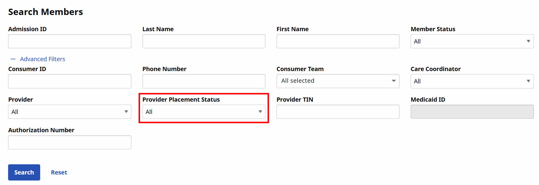 In addition, the Provider Placement Status filter has been added to the Advanced Search Filters.
