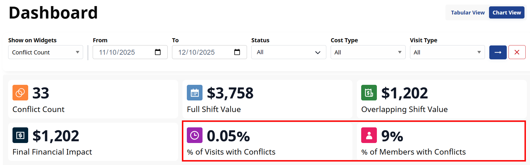 % of Visits with Conflicts: Shows a ratio of Visits to Conflicts