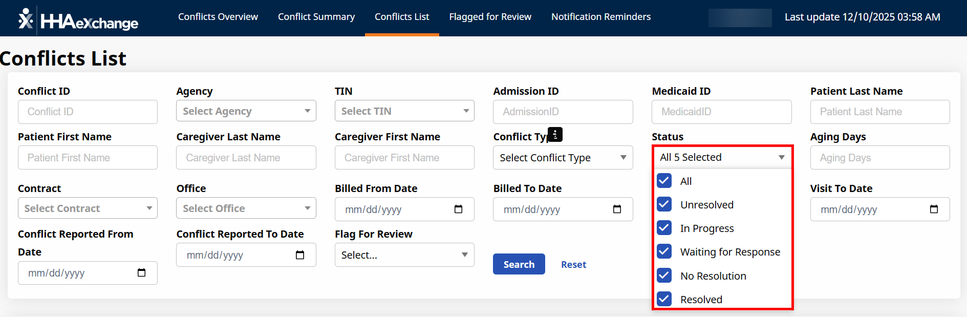 In Conflict Management, the Status search field now allows you to select multiple statuses. This allows you to see all types of unresolved conflicts at the same time.