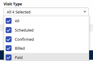 A new multi-select filter has been added for Visit Type, allowing you to filter out scheduled visits.