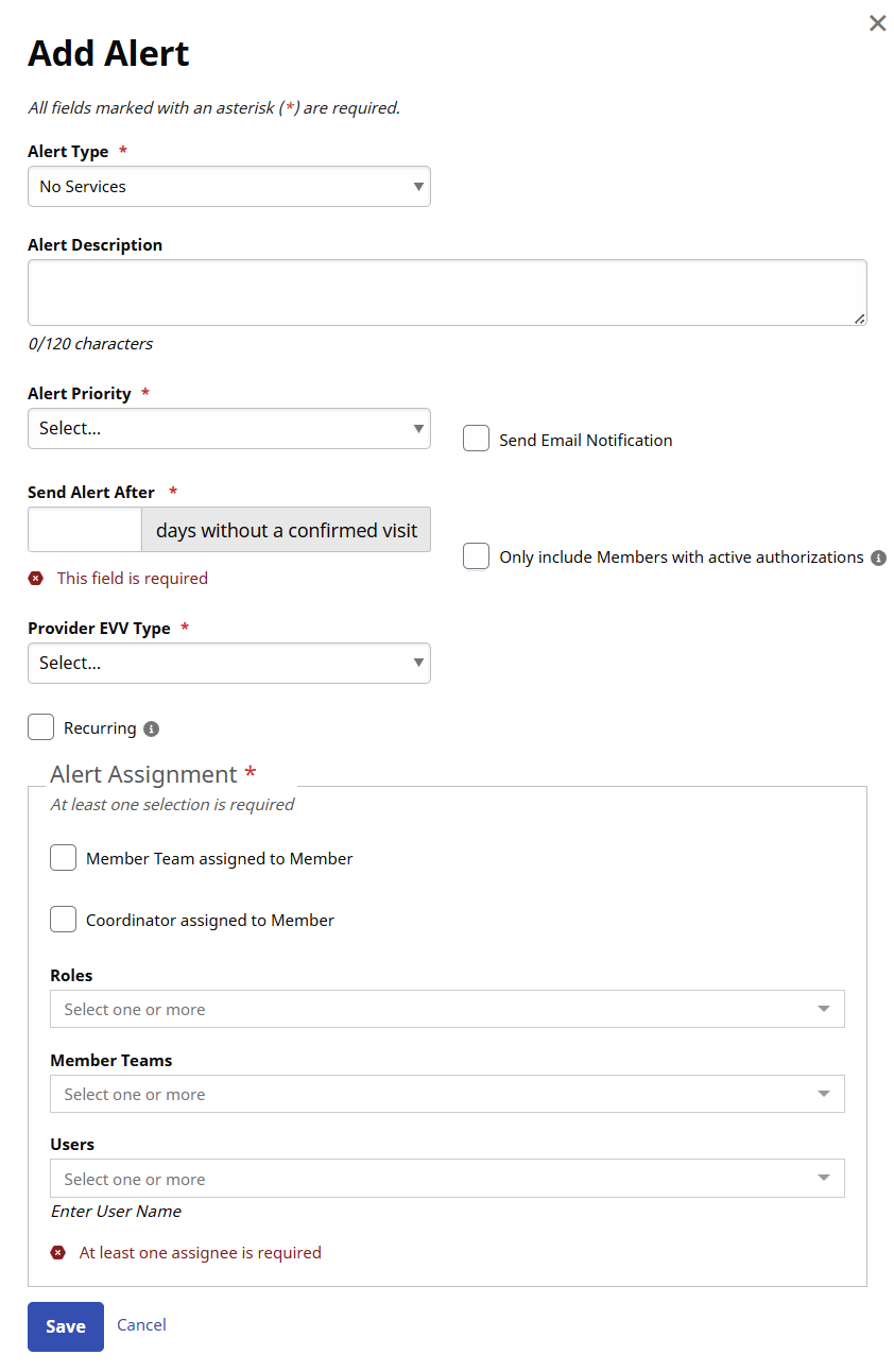 When creating a No Services, No Services After Authorization Start, or No Services After Placement Start alert, you can now select whether the alert should trigger for all records, for records where HHAeXchange is the EVV provider, or for records where a third-party is the EVV provider.