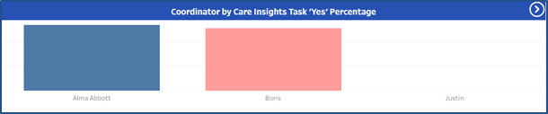 The first column graph widget provides a visual of Coordinators with the highest percentage of Yes responses for Care Insight duties. Clicking on any segment of these graphs provides a summary of the selected point.