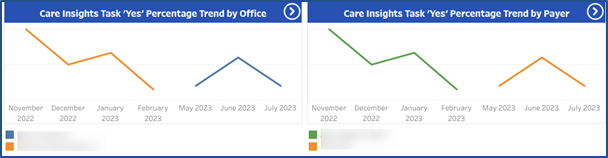 The summary widgets of the Care Insights Dashboard show a percentage trend by Provider Office and by Payer, per month for the past 12 months. The line graph on the left shows a comparison between offices. Hovering over any part of the coordinates in the graph displays a pop-out window indicating information for that precise point.