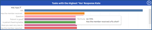 The following (horizontal) bar graph features the Care Insights duties with the highest Yes response percentage in ascending order. Use the scroll bar on the right of the graph to find a specific task.