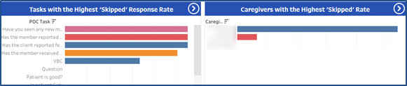 The last graphs provide the Care Insight duties with the highest Skipped response rates (left) and the highest Skipped response rates by Caregivers (right). Use the scroll bar on the right of the graphs to find specific information.