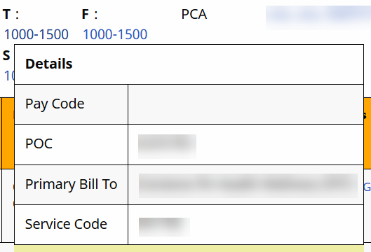 Scheduled Master Week visits. Hovering over the visit link provides a quick-glance view (such as Pay Code, POC, Primary Bill To and Service Code). |