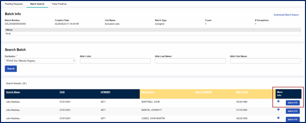 To add the individual to the False Positive List (FPL), click the Add to FPL button under the More Info column of the row in the results screen. The individual is then moved to the False Positives tab.