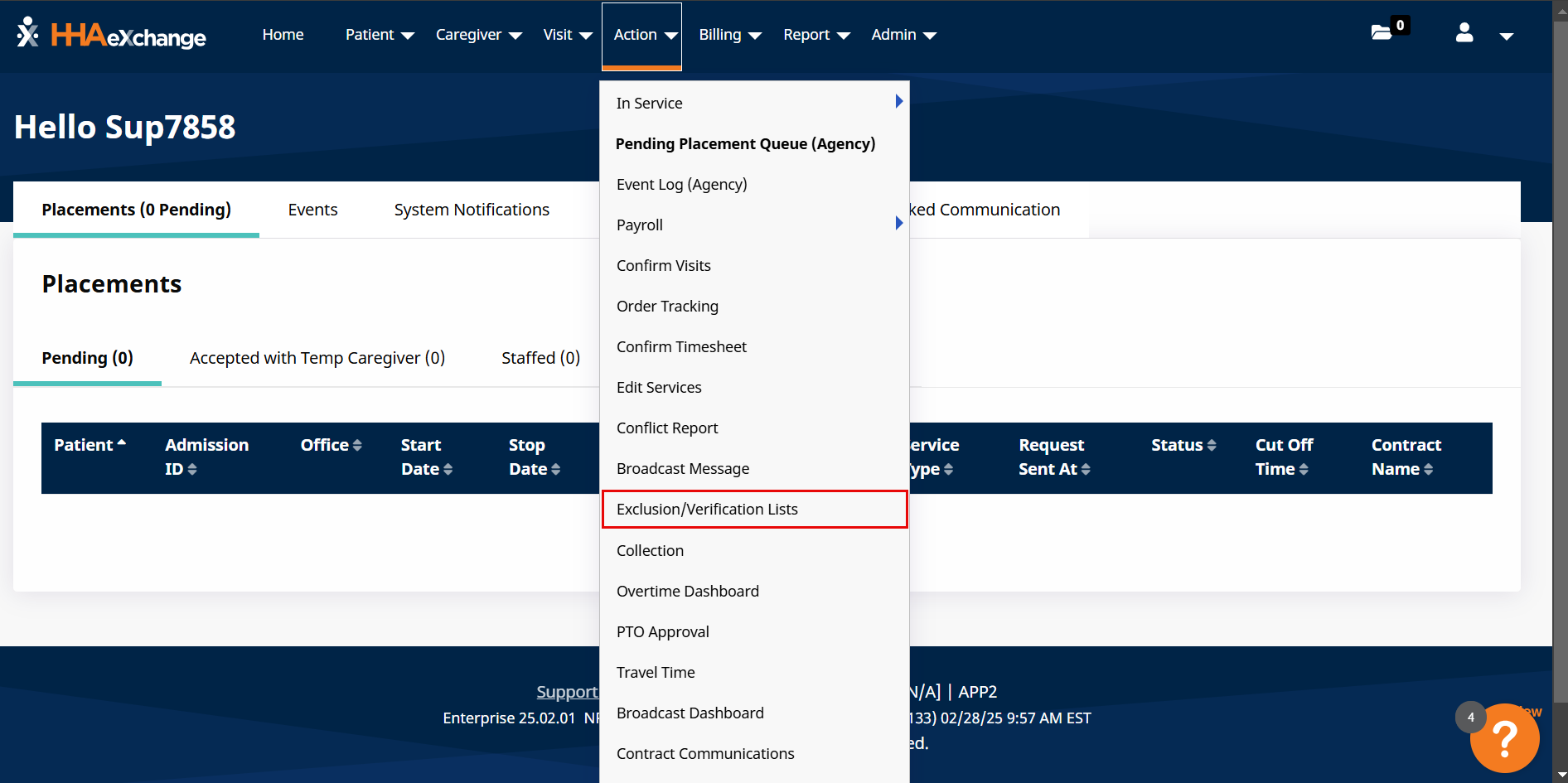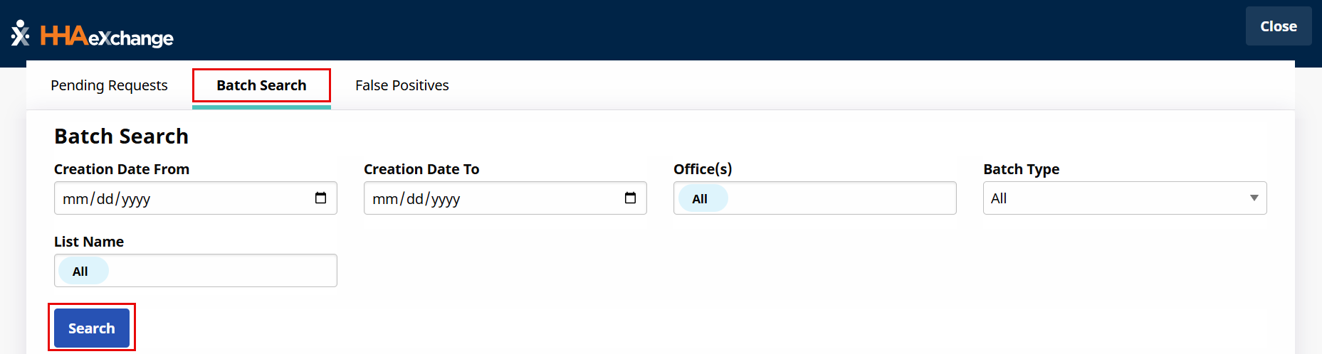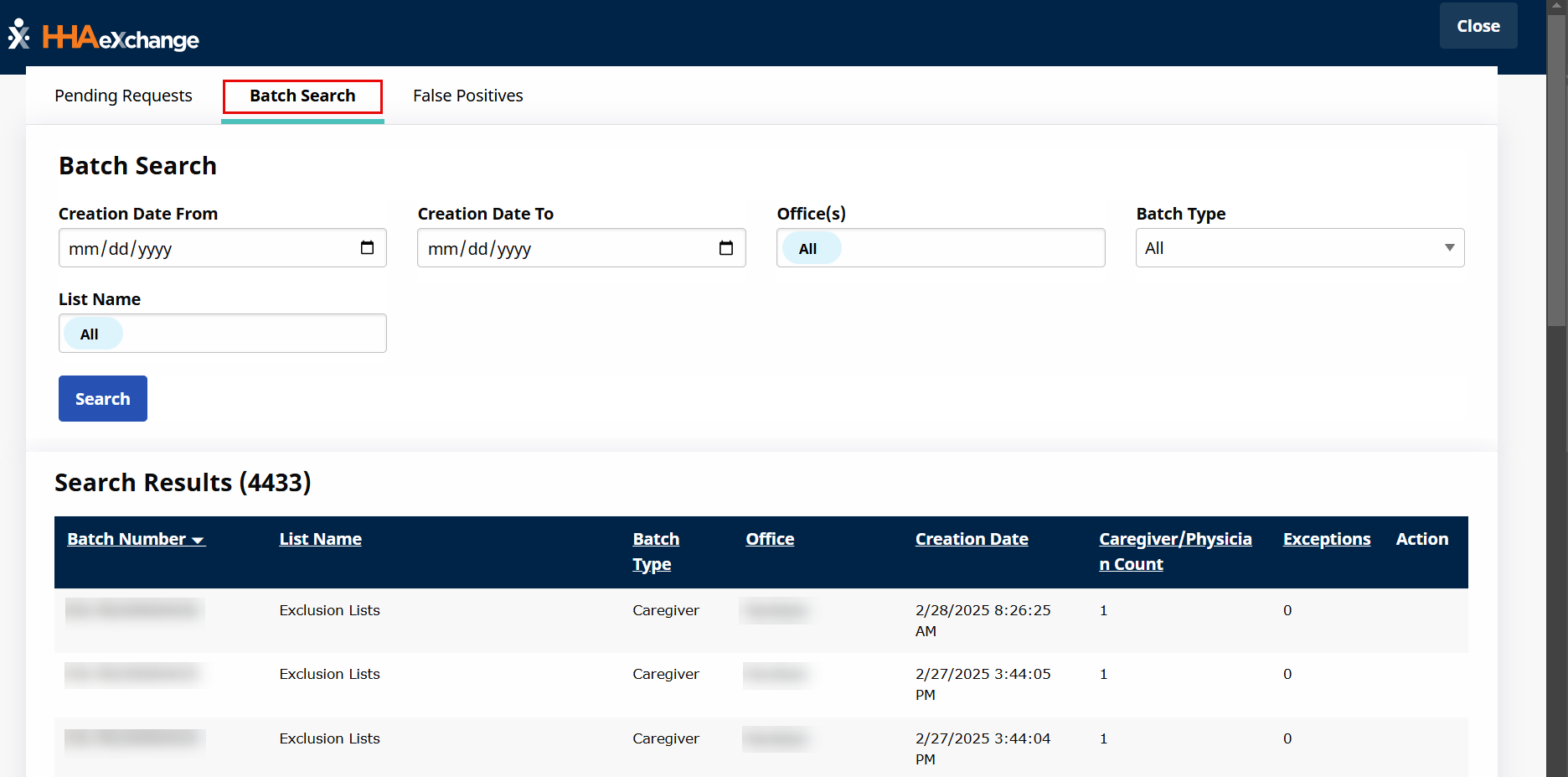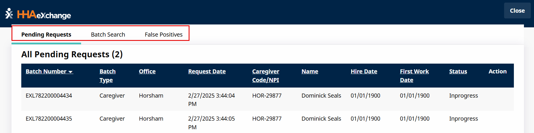 To check the status, search for batches of records, or manage false positive results for Exclusion and Verification Lists, go to Action > Exclusion/Verification Lists. A new window opens to a summary page on the Pending Requests tab. The Pending Requests, Batch Search, and False Positives tabs are covered in the following sections.