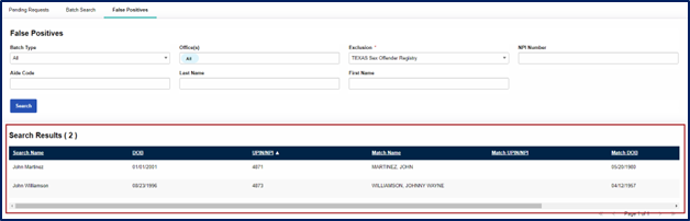 The results are generated in the False Positives tab. Each line item indicates specific high-level information. The first three columns indicate the Name, DOB, and UPIN/NPI number, the following three columns to right display the matching Name, UPIN/NPI and DOB.