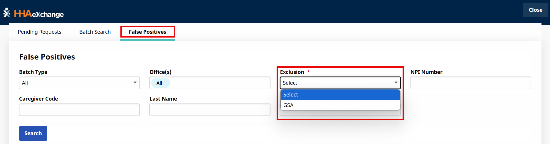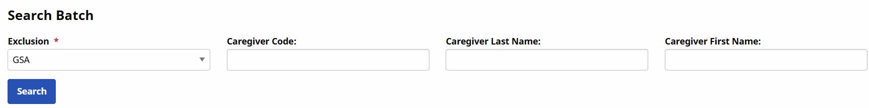 For Search Batch fields, the Exclusion field is required. Select the list and click the Search button to continue.