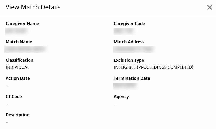 Under the More Info column, click the information icon to open the View Match Details window. Review the information provided and determine if the individual should be added to the False Positive List (FPL). Click the X at the top-right corner to exit the window and return to the results screen.
