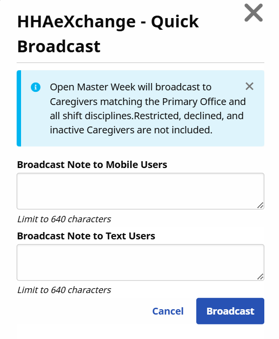 A Master Week with a combination of Skilled and Non-Skilled disciplines cannot be broadcast. Broadcasts only reach Caregivers with the matching criteria to include the Employment Type disciplines in their profile as well as those disciplines shown on the Patient’s authorization.
