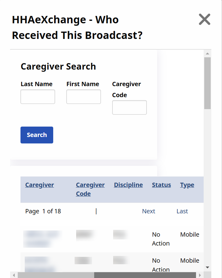 The Caregivers That Received This Broadcast pop-up window lists all Caregivers who gave the shift a Thumbs Up to request the case (shift) on their Mobile App. Selecting the Caregiver’s Name link opens the Caregiver’s Profile. The Status column explains the Action taken by the Caregiver, as follows: