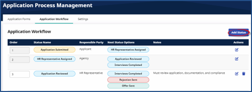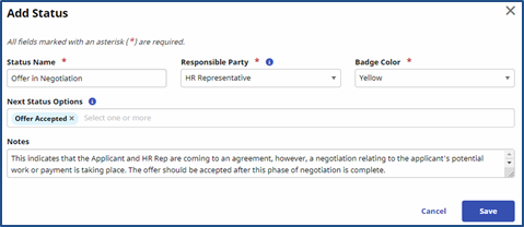 Responsible Party: Click the dropdown menu to select the party responsible for the status to be completed, such as: Agency, Applicant, or HR Representative. Note: The Agency is responsible for updating the actual status in the application.