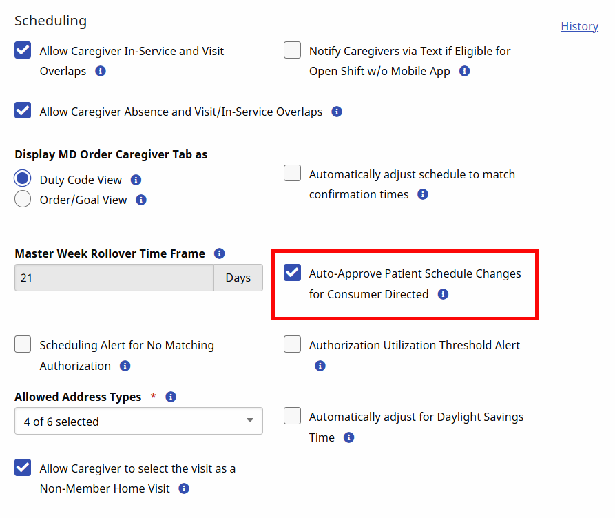 Activating this setting allows the system to immediately confirm/approve any Schedule Request Changes provided there are no conflicts. In addition, the visit must be at least 24 hours in the future and the Caregiver must be available for the requested date and time.
