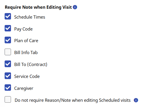 Agencies can choose to require a Note when a user edits specific visit Scheduling (or fields edited on the Visit Info tab of the Visit Window) and/or Billing information for Internal and Linked Contracts.