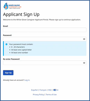 Once the DAO application configurations are complete, Applicants can sign up to the Caregiver Applicant Portal using the shared URL by the Agency.
