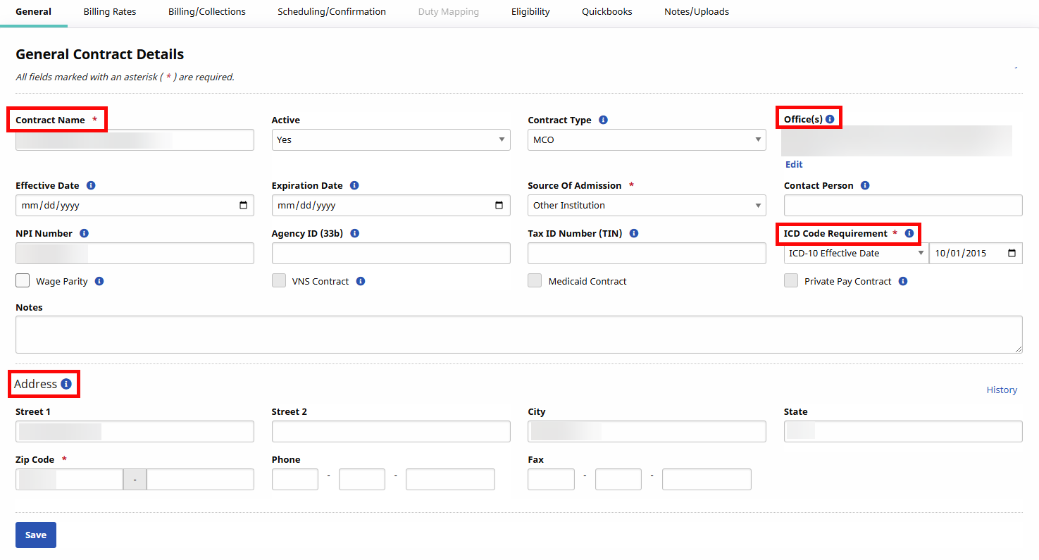 In the General tab, the following fields are read-only for Providers: Contract Name, Offices, ICD Code Requirement, as well as the entire Address section.