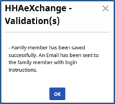 The family member receives an email with login instructions. Click OK to close.
