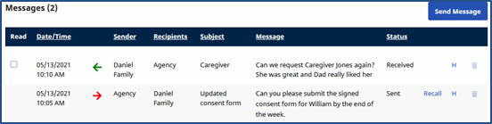The Announcements section houses communications sent by the Agency on a global level (to all Family Portals) or to individual portals. Each line item indicates the Date/Time of the message, the Recipients (Click the link to view specifics), the Subject of the message, the actual Message, and the Status. The attachment (paperclip) icon indicates if an attachment is available (if green in color). Click the H link to view any message history.
