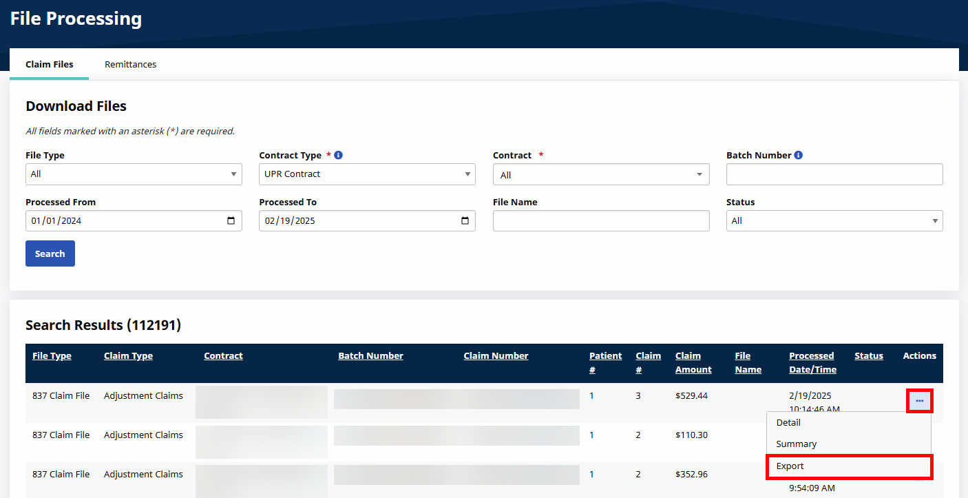 The Claim Files tab captures all invoices, or claims, processed for Linked Contracts. Search results appear under the search filters. Clicking on the ellipses icon under the Action column opens a dropdown with additional options: Claim files can be viewed by clicking on Detail and Summary and extracted from HHAeXchange using the Exportoption.