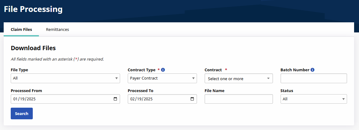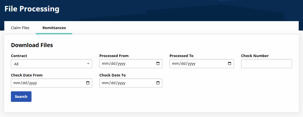 You can use the File Processing feature to manage Linked Contract billing. The File Processing feature is available under Admin > File Processing, and consists of two tabs Claim Files and Remittances to view what is billed and what is received by an Agency. Both tabs include search filters to narrow searches to a particular File Type, Contract, Batch Number, File Name, and Processing date ranges.