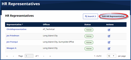 On the HR Representatives page, Providers can add and edit HR Representatives in the application. HR Representatives are responsible for Applicant management corresponding to their assigned office(s).